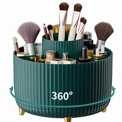 his rotating organizer is designed to store makeup brushes, skincare items, nail polish, and small daily essentials in one place. The 360° rotation helps with easy access, making it suitable for bathroom counters, vanity tables, or workspaces.